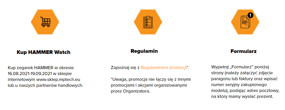 14. Aby otrzymać Prezent, Uczestnik musi dokonać zakupu zegarka HAMMER Watch w terminie do 19 września 2021 r. (liczy się data na dowodzie zakupu), zarejestrować poprawnie zakup w formularzu zgłoszeniowym, o którym mowa poniżej oraz mieć dostęp do działającego urządzenia w momencie weryfikacji w określonych w regulaminie terminach.