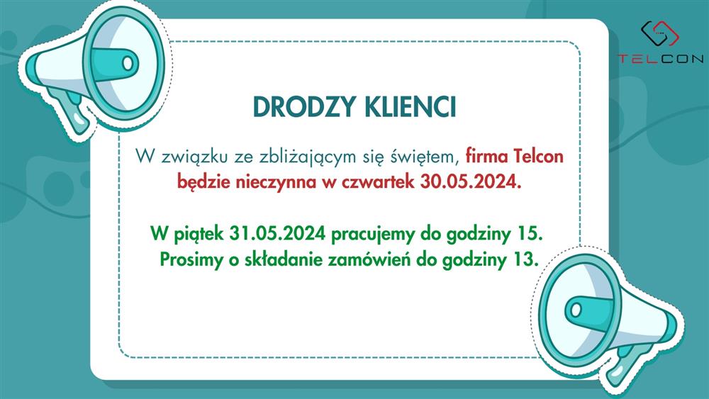 firma Telcon będzie nieczynna w czwartek 30.05.2024.