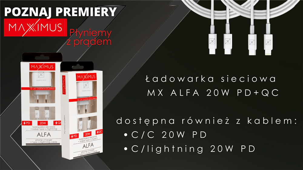 MX Alfa to ładowarka sieciowa o mocy 20W. Produkt posiada dwa wyjścia o różnych typach: USB-C oraz USB-A, co pozwala na ładowanie dwóch, różnych urządzeń jednocześnie. Produkt jest bezpieczny oraz wygodny w użyciu.