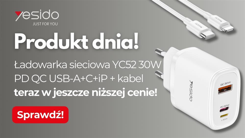 Ładowarka sieciowa Yesido YC52 PD 30W QC USB-A+C+iP+ kabel 27W typ-C-lightningw jeszcze niższej cenie!