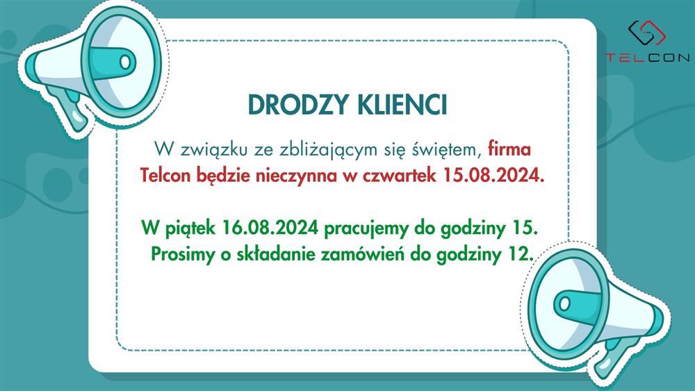 W związku ze zbliżającym się świętem, firma Telcon będzie nieczynna w czwartek 15.08.2024.