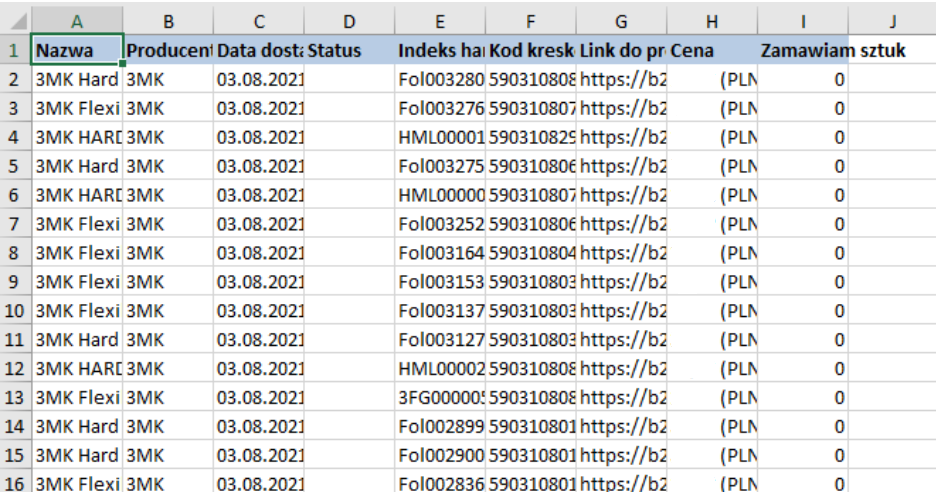 2. W pobranym pliku edytuj jedynie ilość przy produktach, które chcesz zamówić.