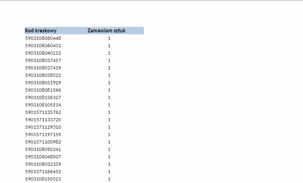 Plik xlsx musi tylko zawierać 2 kolumny: kod kreskowy i ilość (uwaga w pierwszym wierszu należy umieścić nazwy kolumn : "kod kreskowy" i "ilość".