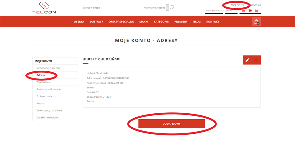 1. Zaloguj się na naszą stronę https://b2b.telcon.pl/. 2. Kliknij w „MOJE KONTO” w prawym górnym rogu. 3. Wybierz opcję „ADRESY”.