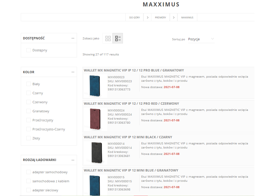 Po wybraniu konkretnej marki, czyli MX, zobaczymy produkty, które są oznaczone jako nowości, a wśród nich właśnie pokrowce Magnetic VIP.